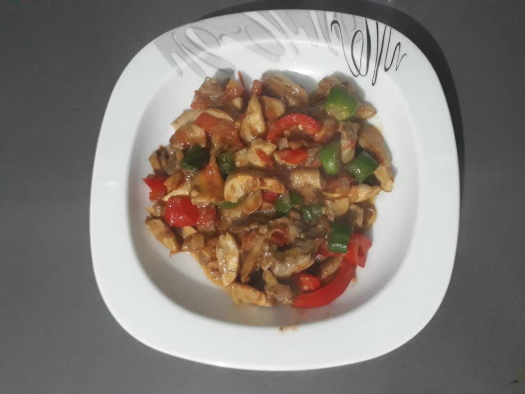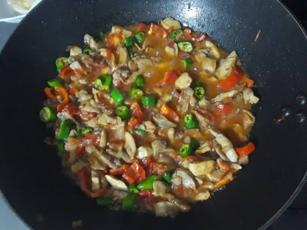 Biz gelelim Evelek mantarımıza. Hemen mantarı iri iri doğradık. Yarım saat kadar tuzlu suda beklettik ki o yabani kendine has kokusunu tuz alsın diye. Sonra soğanları doğradık annemin tereyağında (yoğurt tereyadıdır) pembeleşinceye kadar karıştırdık. Suda olan mantarların suyunu sıkarak tavamıza aktardık. Yüksek ateşte suyunu salıp çekinceye kadar pişirdik. Üzerine iki domates, biraz yeşil biber, biraz kapya ekledik. Sonra sonrası ne mi oldu.